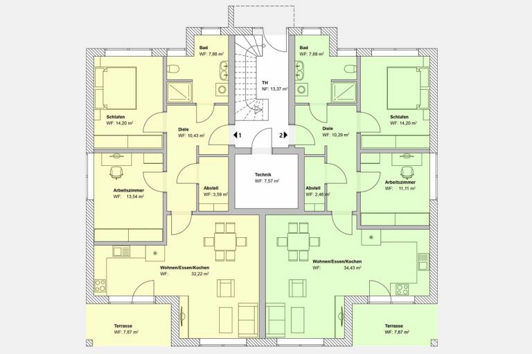 Zu jeder Wohnung gehört ein Autostellplatz und ein separater Fahrradschuppen. Für Wärme sorgt eine Fußbodenheizung, welche über eine efektive Wärmepumpe mit Tiefenbohrung betrieben wird. Über diese Wärmepumpe wird auch das Wasser erwärmt. Eine automatische Lüftungsanlage sorgt für ausreichend frische Luft. Alle Fenster sind mit elektrischen Rolläden ausgestattet. Die Elektroanlage ist nach dem modernsten Standard errichtet. Genügend Steckdosen, Antennen- und Datendosen sind vorhanden. Die Steuerung der Elektroanlage kann über ein separates Display oder herkömmlich über die Lichtschalter erfolgen. Besucher kündigen sich über die Videosprechanlage an. Eine Photovoltaikanlage sorgt für günstigen Strom. Der Anschluss einer eigenen Wallbox ist vorgesehen.